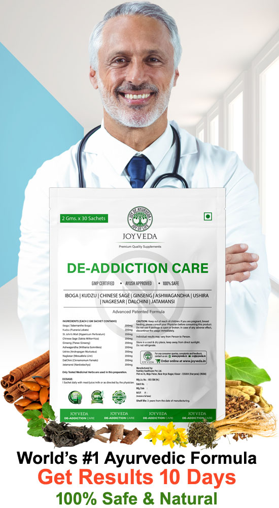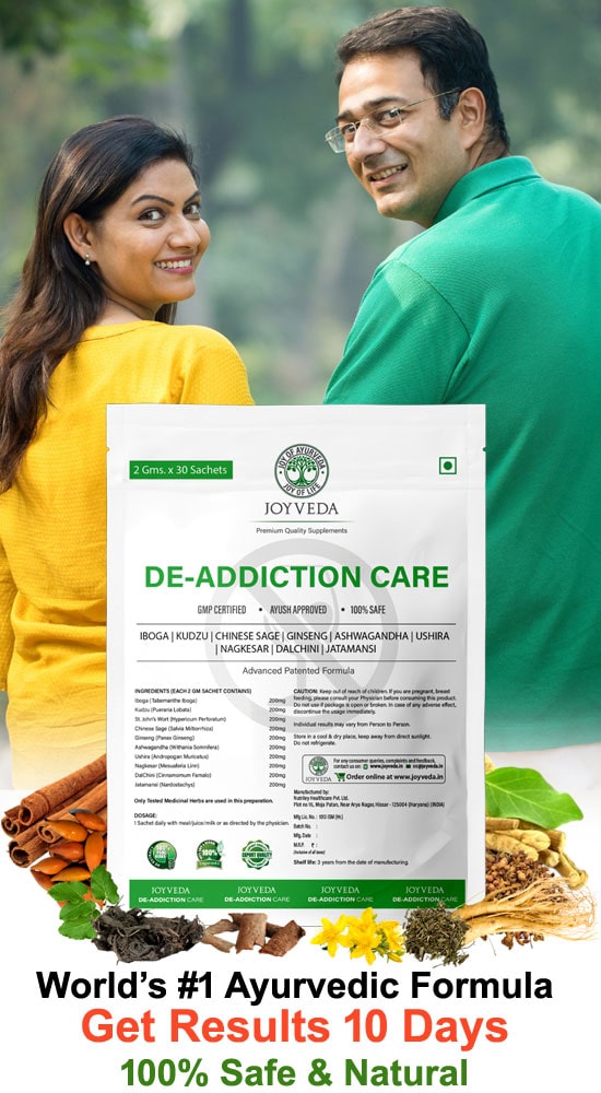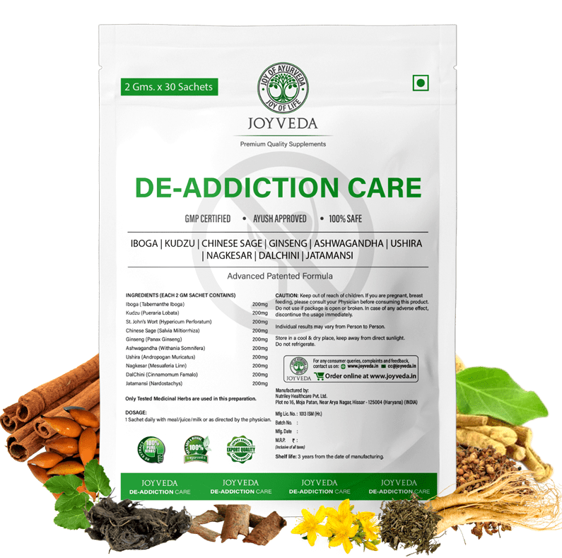 जॉयवेदा डी-एडिक्शन केयर सप्लीमेंट्स अद्वितीय हर्बल फॉर्मूलेशन का मिश्रण है जो नशा करने की इच्छा को नियंत्रित करने में मदद करता है और शराब, धूम्रपान और मादक पदार्थो की लत से स्थायी राहत प्रदान करता है। यह तनाव, चिंता और थकान को भी कम करता है। यह शरीर को डिटॉक्सीफाई और रिकवर भी करता है।